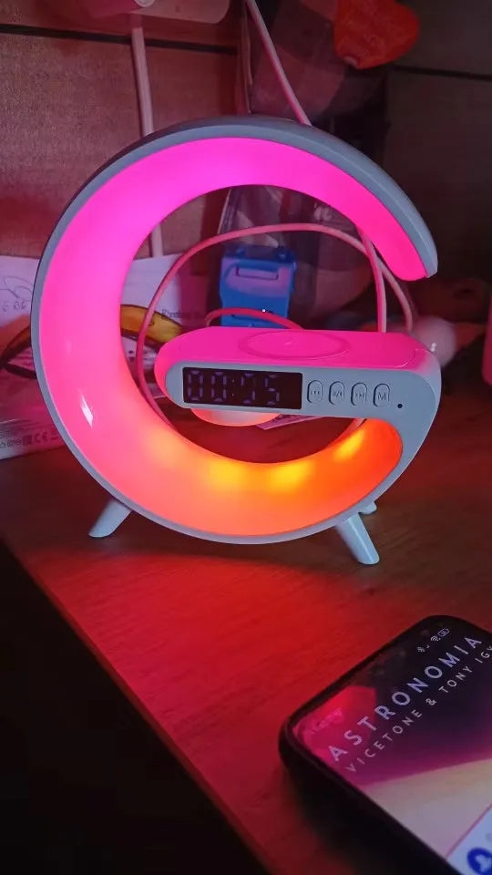 Say goodbye to clutter and hello to a more organized desk with this multifunctional device. Combining a fast wireless charger, ambient RGB lights, Bluetooth speaker, and an alarm clock, it's perfect for creating a serene workspace or bedroom environment. The sleek design not only enhances aesthetics but also streamlines your daily routine. Ideal for iPhone, Samsung, and Huawei users, who need convenience and efficiency in a stylish package.
